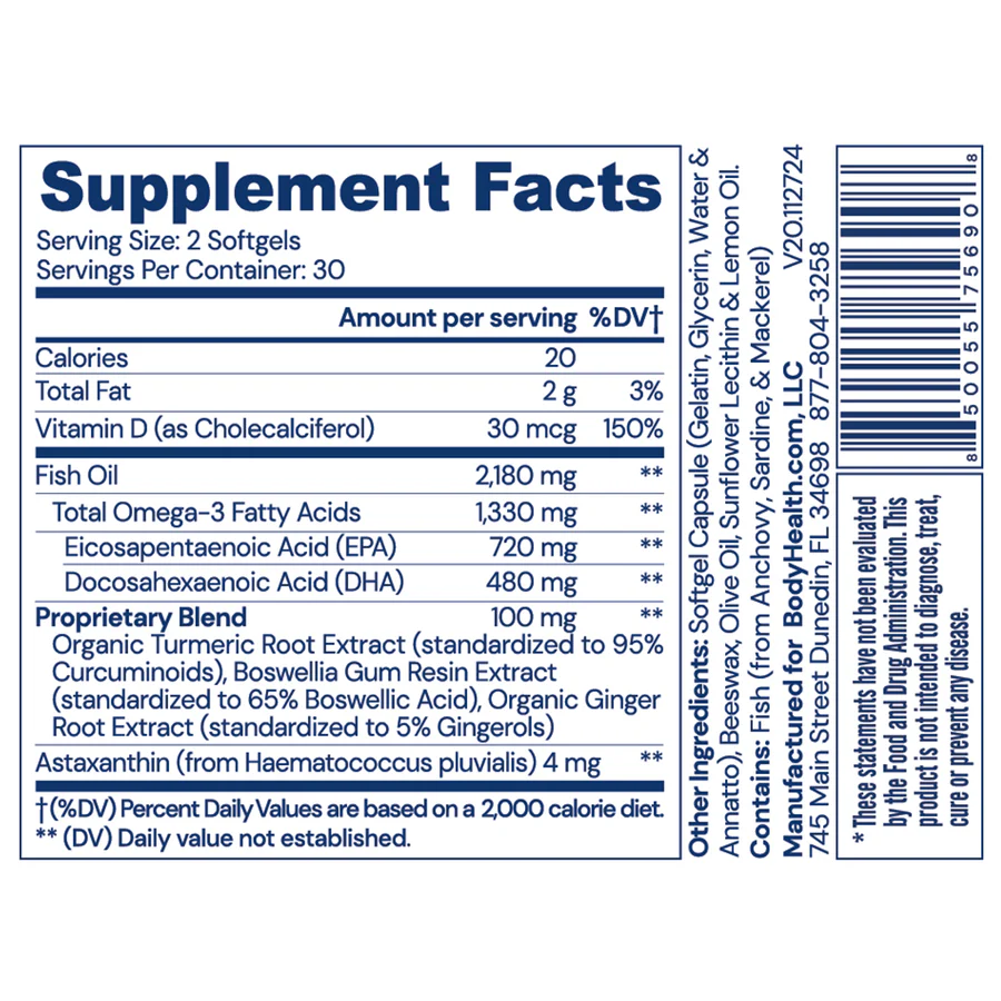 Omega-3 from BodyHealth is a high-quality fish oil softgel formulated to support key areas of health that many modern diets lack. Each serving delivers a potent blend of EPA and DHA fatty acids, nutrients your body needs for normal brain and heart function, immune activity, and balanced inflammation response. The formula also includes vitamin D3 plus antioxidant support from astaxanthin and a botanical blend of turmeric, ginger, and boswellia.